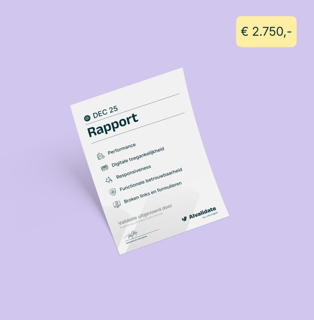De vaste prijs voor AIvalidate is € 2.750,-. Dit bedrag is inclusief de volledige validatie en een rapport met overzicht, duiding en prioriteiten. Er zijn geen aanvullende kosten of verplichtingen.